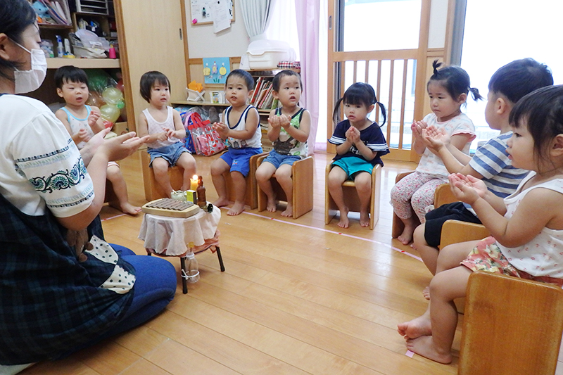 絵本などを使わずに、静かに物語に耳を傾けます。物語の人物像や情景を自分でイメージし、物語の世界を体験することで、想像力・思考力を高める活動です。